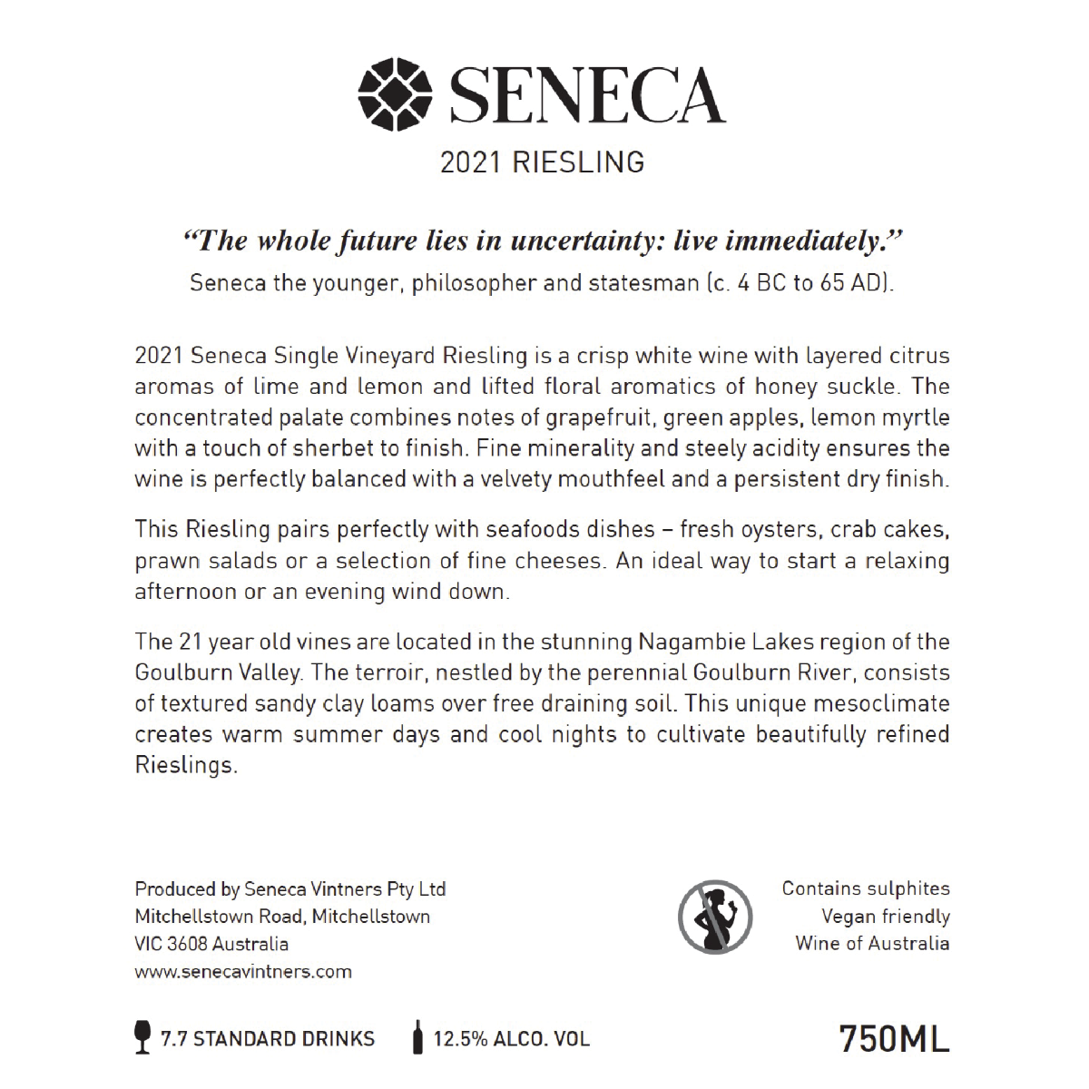 2021 Seneca Single Vineyard Riesling is a crisp white wine with layered citrus aromas of lime and lemon and lifted floral aromatics of honeysuckle. The concentrated palate combines notes of grapefruit, green apples, lemon myrtle with a touch of sherbet to finish. Fine minerality and steely acidity ensure the wine is perfectly balanced with a velvety mouthfeel and a persistent dry finish.